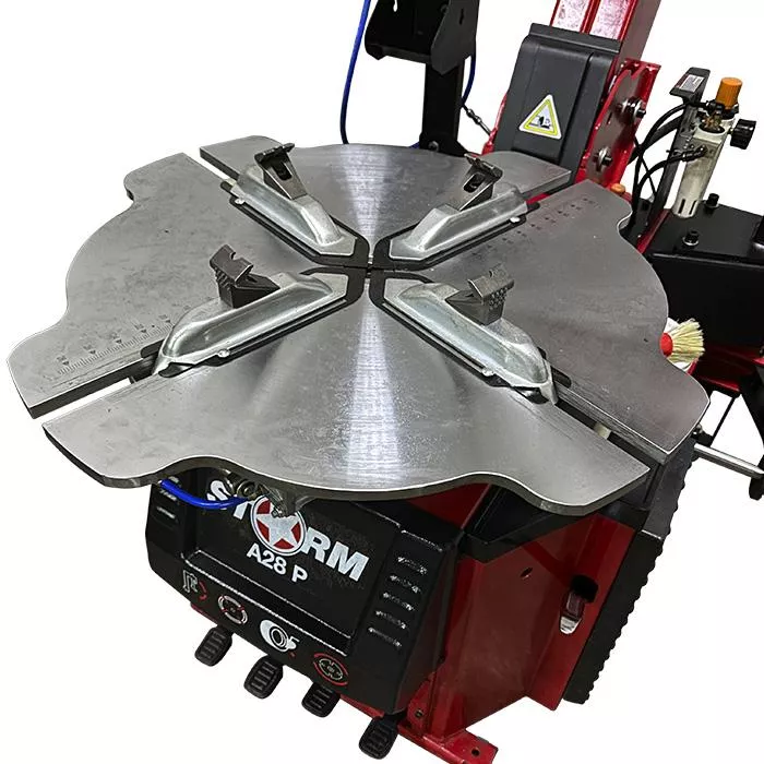СТОРМ-А28P - предназначен для работы с дисками до 28” Вращение стола (станки 220В) 7 об/мин. Внутренние размеры диска (внешний зажим) 12”-26” Внешние размеры диска (внутренний зажим) 14”-28” Максимальный диаметр колеса 1060 мм. Усилие отжимной лапы 3500 кг. Максимальная ширина шины 370 мм. Напряжение питания 220/380В. Гарантия 24 месяца.