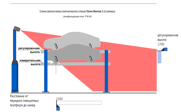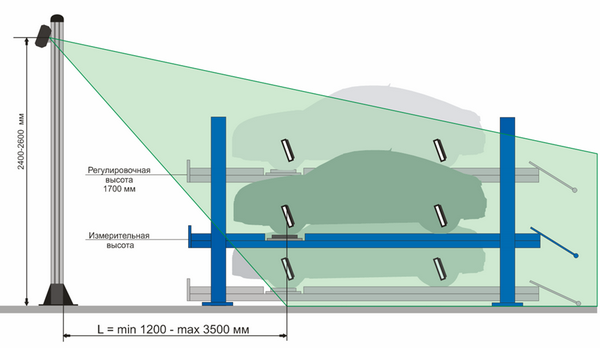 Двухкамерные стенды сход-развал Техно Вектор 7 могут использоваться как на яме так и на подъемнике, для предварительного расчета рабочих высот подъемника можно воспользоваться приведенной ниже системой.